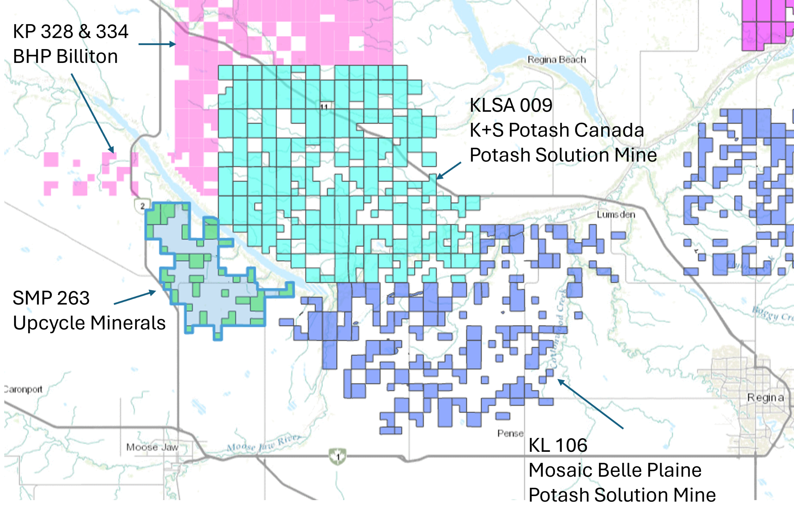 Upcycle Minerals future SOP facility will be located on the Tuxford Potash permit (SMP 263). The permit consists of 10,565 acres of crown mineral rights and has a total area of 26,793 acres including freeheld mineral rights. The permit is located approximately 18 km north of Moose Jaw Saskatchewan and borders the village of Tuxford on the western edge and Buffalo Pound Lake on its north/east boundary. The permit also borders the K+S Bethune and Mosaic Belle Plaine solution mining properties.